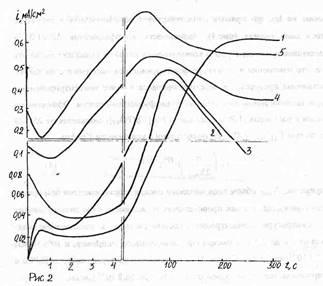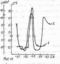 Параллельно проводились измерения изменения температуры в приэлектродном слое. В начальный момент спада тока температура приэлектродного слоя, в зависимости от Е и состава раствора, может возрастать почти до 100 °С. Для всех растворов окрашивания как на начальном этапе процесса в условиях нестационарной диффузии, так и в условиях длительной поляризации кривые i-Er