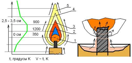 Горение – процесс более сложный, чем кажется. В общем случае, зажигание требует подогрева горючей поверхности до температуры, при которой данное вещество начинает разлагаться, испуская горючие газы. И лишь разогрев этих газов до температуры их воспламенения при доступе окислителя – приводит к собственно воспламенению вещества. Горящие газы еще сильнее разогревают поверхность, ускоряя процесс газообразования с поверхности и окисления этих газов. Поэтому пламя со временем достигает определенного размера и постепенно распространяется по поверхности тела (жидкости), как бы «ползет» по нему. Если же температура недостаточна для воспламенения образующихся газов, то продолжается разложение приповерхностных слоев и частичное окисление материала. Проявляется это в виде обугливания поверхности. В случае если температура достаточна для горения, но отсутствует окислитель, происходит полное разложение телесного вещества (термический распад или пиролиз) и выделяется масса горючих газов и паров летучих компонентов. Может образовываться и жидкость, в зависимости от материала. Пламени при этом не наблюдается. Примером подобного процесса может служить коксование.