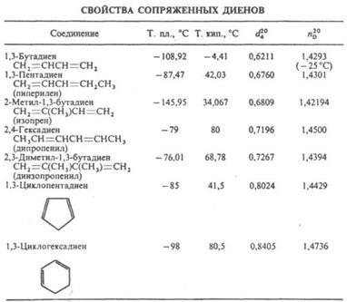 и др. Обычно под термином диеновые подразумевают соединения с сопряжёнными двойными связями. В таких соединениях имеет место сопряжение p-связей и образование единого p-электронного облака, что обусловливает повышение энергии образования молекулы, некоторое усреднение расстояний между атомами углерода диеновой системы, высокую поляризуемость молекулы и способность её вступать, наряду с обычными реакциями присоединения по двойным связям (1,2-присоединение), в реакции присоединения по концам сопряжённой системы (1,4-присоединение). Так, бутадиен-1,3 присоединяет молекулу брома с образованием 3,4-дибромбутена-1 и 1,4-дибромбутена-2: