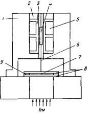 Применение второй оптической установки (рис. 3) также предполагает наличие двух источников излучения: одного — для инициирования процесса полимеризации, второго — с целью получения зондирующего луча. Принцип действия установки основан на измерении светового потока зондирующего луча, частично затемненного специальной шторкой, опирающейся на верхнее оптическое стекло реакционной ячейки.
