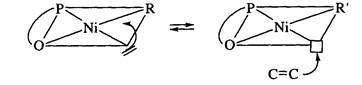 По нашим сведениям это единственный комплекс, который вызывает димеризацию а-олефинов, приводя к преимущественному образованию линейных продуктов. Для этого нужно, чтобы реакция присоединения катализатора Ni-H к а-олефину протекала против правила Марковникова (уравнение (1)).