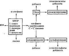 Олигомеризация олефина осуществлена компанией "Шелл" (процесс "Шелл" для получения высших олефинов - SHOP-процесс) [1, 5]. Этот процесс с общим объемом продукции ~1 млн. т является одним из примеров наиболее крупномасштабного применения гомогенного катализа на основе переходных металлов. На схеме II показаны первичные и вторичные продукты, получаемые в указанном процессе (добан, добанол, этоксилаты добанола и этоксисульфаты добанола - торговые названия поверхностно-активных веществ (детергентов))