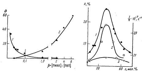 При изучении реакции между фенильными группами сополимеров стирола и α-метилстирола и 9-хлорметилантраценом было обнаружено, что зависимость реакционной способности сополимеров от их состава представляет собой колоколообразную кривую (рис. 8, кривая 1) [25]. Ход этой зависимости хорошо коррелирует с ходом зависимости динамических характеристик участков цепей сополимеров, содержащих прореагировавшие фенильные группы, от состава сополимера (кривая 2). Динамические характеристики этих участков были определены методом поляризованной люминесценции при использовании в качестве меток тех антраценовых групп, которые присоединились в процессе исследуемой реакции. Внутримолекулярная подвижность тех же сополимеров, также определяемая методом поляризованной люминесценции, но с помощью антраценсодержащих меток, введенных при сополимеризации и случайным образом распределенных вдоль сополимерных цепей, лишь в слабой степени зависит от состава сополимеров (кривая 3). Сопоставление кривых 2иЗ показывает, что реагент в процессе исследованной реакции выбирает для атаки те фенильные группы, которые расположены в наиболее подвижных участках полимерных цепей.