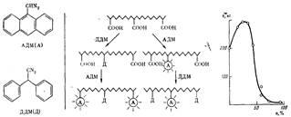 Эти работы создали основу для исследования реакций образования макромолекул с помощью изучения их локальных динамических свойств. Действительно, если при исследовании определенной реакции образования полимера использовать реагенты (инициатор, сомономер, сшивающий агент), содержащие люминесцирующую (например, антраценовую) группу, то образуются меченые полимеры. Исследование динамических свойств тех фрагментов полимерной системы, которые содержат антраценовые группы, и их сопоставление с динамическими свойствами модельных полимеров соответствующего химического строения с известным расположением меток может дать важную информацию при изучении механизмов исследуемых реакций.