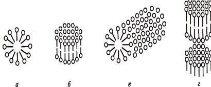 Рис.1. Формы мицелл: а — сферические; 6 — дискообразные; в — цилиндрические; г — пластинчатые