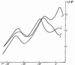 Рис. 1. Температурные зависимости tgб для ПХМ-5, ПХМ-10 (2) и ПХМ-14 (3) при 0,1 кГц (области низкотемпературных процессов) первой достаточно гибкой развязкой, появляется второй процесс релаксации, свидетельствующий о локальном характере и автономии движения обеих сложноэфирных групп [5].