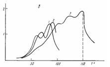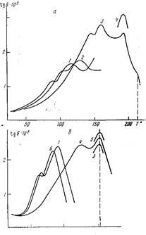 В ПХМ-10 температурное положение промежуточного мезофазного перехода (124°) совпадает с пиком диэлектрических релаксационных потерь (ниже он будет обозначен цифрой 1) при высоких частотах (рис. 2, б). Наблюдаемую при этих температурах область tg 6MaK
