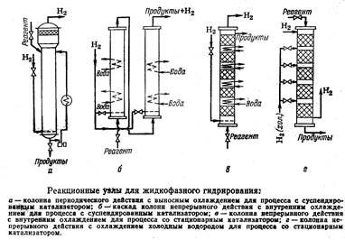 Жидкофазное гидрирование проводят путем барботирования водорода через жидкую реакционную массу. Таким способом всегда гидрируют высококипящие вещества (жиры, высшие карбоновые кислоты и их эфиры, динитросоединения), поскольку для перевода их в состояние насыщенного пара потребовались бы слишком большие затраты. Однако в жидкой фазе можно гидрировать и более летучие соединения (при высоком давлении).
