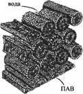 Как видно из рис., такая фаза возникает при регулярной упаковке небольших мицелл, которые сохраняют свойства, присущие мицеллам в растворе. По форме мицеллы представляют собой не сферы, а скорее короткие вытянутые эллипсоиды с соотношением осей 1: 2, что обеспечивает более плотную их упаковку. Это чрезвычайно вязкая фаза.