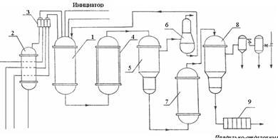 1- смеситель реагентов; 2 – выравниватель температур; 3 - дозирующая установка; 4 – реактор; 5 – демономеризатор; 6 – сепаратор-конденсатор; 7 – бак меланжирования; 8 – деаэратор; 9 – фильтр-пресс