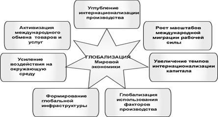 переход производства в международную форму (транснационализация) и ускоренное движение факторов производства и готовой продукции в рамках мирового экономического пространства;
