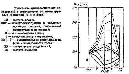 Динамика некоторых физиологических сдвигов, а также словесный отчет испытуемых свидетельствовали о том, что внушаемые психические состояния реализуются полностью. Обращает на себя внимание тот факт, что при моделировании эмоционального напряжения у испытуемых часто развивалась гипервентиляция с последующими жалобами на головокружение. Нередко для того, чтобы исключить развитие гипокапнической гипоксии, приходилось во время эксперимента снижать частоту дыхания специальным внушением.