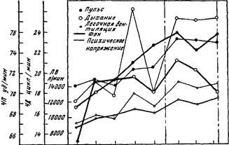Таким образом, в моделируемом состоянии психического напряжения пилотирование осуществляется с уменьшением дисперсии ошибок управления, со снижением запаздывания в отклонении органов управления. Качество пилотирования свидетельствует о значительной мобилизации психофизиологических возможностей оператора в данном состоянии. Это же подтверждают и регистрируемые в «полете» физиологические показатели состояния оператора. В частности, сдвиги функций дыхания достаточно четко свидетельствуют о том, что напряженность состояния оператора в «полете» возрастает в значительной степени.