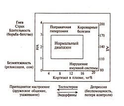 Взаимодействие двух мозговых систем, регулирующих поведение борьбы/бегства и поведенческое торможение. На ординате представлена шкала активации системы: миндалина — симпатическая нервная система — мозговое вещество надпочечников, регулирующая уровень НА и А и оборонительное поведение от борьбы / бегства до релаксации и сна. Она отвечает на активацию синего пятна ростом НА (А) в плазме и увеличением кровяного давления (АД). На абсциссе — шкала активации системы: гипофиз — кора надпочечников, регулирующая уровень кортизола, тестостерона и эндорфинов. Увеличение ее активации приводит к депрессии, для которой характерны высокий уровень кортизола и эндорфина, снижение содержания тестостерона.