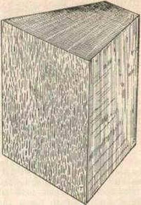 На поперечном разрезе ствола можно видеть концентрические слои, расположенные вокруг сердцевины. Эти образования называются годичными слоями и в большинстве случаев представляют собой ежегодный прирост древесины. Годичные слои хорошо заметны у всех пород, но особенно хорошо у хвойных. На радиальном разрезе годичные слои имеют вид продольных полос, на тангенциальном — извилистых линий (Рис. 1). Годичные слои нарастают ежегодно от центра к периферии.Строение ствола схематически можно представить следующим образом: годичные слои накладываются один на другой, как сплошные конусы, имеющие общий стержень — сердцевину. Из приведенного рисунка видно, что число слоев по высоте ствола уменьшается. Это объясняется ростом дерева не только в толщину, но и в высоту. По числу годичных слоев можно определить возраст той части ствола, где прошел разрез. Ширина годичных слоев зависит от породы, условий произрастания, положения в стволе. У одних пород (быстрорастущих) годичные слои широкие, до 1—1,5 см (тополь, ива), удру-гихузкие, до 1 мм (самшит, тис). В нижней части ствола годичные слои более узкие, вверх по стволу ширина слоев увеличивается. У одной и той же породы ширина годичных слоев может быть различной. При неблагоприятных условиях роста (засуха, морозы, недостаток питательных веществ, заболоченные почвы) образуются узкие годичные слои. В отдельные годы образования годичных слоев может не происходить из-за недостатка питания, чрезмерной обрезки ветвей и пр. Иногда на двух противоположных сторонах ствола годичные слои имеют неодинаковую ширину. Например, у деревьев, растущих на опушке леса, на стороне, обращенной к свету, годичные слои имеют большую ширину, вследствие чего сердцевина смещена и ствол имеет эксцентричное строение. Некоторым породам свойственна неправильная форма годичных слоев. Так, у граба, можжевельника на поперечном разрезе наблюдается волнистость годичных слоев.
