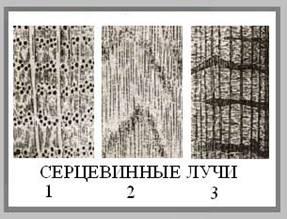 На поперечном разрезе некоторых пород хорошо видны невооруженным глазом светлые, часто блестящие, направленные от середины к коре линии – сердцевинные лучи. Они имеются у всех пород, но видны лишь у некоторых.