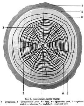 При рассмотрении разрезов ствола дерева невооруженным глазом или через лупу можно различить следующие основные его части: кору, камбий, древесину и сердцевину.