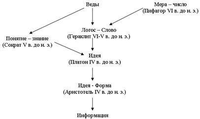 Итог развития великой древнегреческой мысли и зафиксировали древние римляне в понятии информация: информация - идеальное, смысло - и формообразующее начало мира. Схема возникновения понятия информация (рис.3)