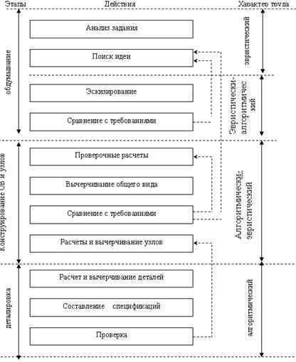 Процесс конструирования как процесс труда неоднороден (рис. 1.). На разных его этапах совершаются различные действия с существенно отличающимся характером труда - от эвристического до алгоритмического.