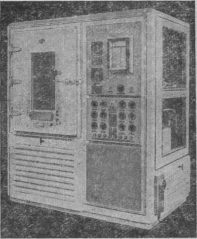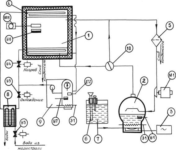 1 — излучатель инфракрасных лучей; 2 — излучатель ультрафиолетовых лучей; 3 — стол для испытуемых изделий; 4 — щит коммутации с блокировкой; 5 — блок электрического питания; 5 — щит питания; 7 — щит управления и сигнализации; 8 — коллектор; 9 — привод стола.