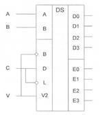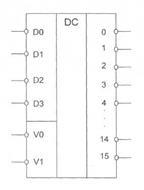Дешифраторы входят в состав нескольких серий ТТЛ. В качестве примера приведено условное обозначение микросхем дешифратора 4x16 типа К155ИДЗ (рис. 4). Если на обоих входах разрешение VO=V1=0, микросхема работает как дешифратор. Потенциал VO=1, Vl=l устанавливает уровень "1" всех выходах независимо от состояния входов. Данные микросхемы позволяют наращивать разрядность дешифратора.