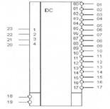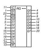 1 – вход режимный S0; 2 – вход последовательного ввода информации при сдвиге вправо DR; 3 – вход информационный D0; 4 – выход Q0; 5 – вход D1; 6 – выход Q1; 7 – вход D2; 8 – выход Q2; 9 – вход D3; 10 – выход Q3; 11 – вход синхронизации С; 12 – общий; 13 – вход инверсный "сброс" R; 14 – выход Q4; 15 – вход D4; 16 – выход Q5; 17 – вход D5; 18 – выход Q6; 19 – вход D6; 20 – выход Q7; 21 – вход D7; 22 – вход последовательного ввода информации при сдвиге влево DL; 23 – вход режимный S1; 24 – напряжение питания;