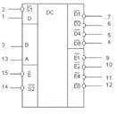 Назначение выводов: 1 – вход информационный, 2 – стробирующий вход, 3, 13 – адресный вход, 4, 5, 6, 7, 9, 10, 11, 12 – выходы, 8 – общий, 14 – стробирующий (инверсный) вход, 15 – вход информационный (инверсный), 14 –напряжение питания