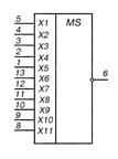 1 – вход X5; 2 – вход X4; 3 – вход X3; 4 – вход X2; 5 – вход X1; 6 – выход Y; 7 – общий; 8 – вход X11; 9 – вход X10; 10 – вход X9; 11 – вход X8; 12 – вход X7; 13 – вход X6; 14 – напряжение питания;