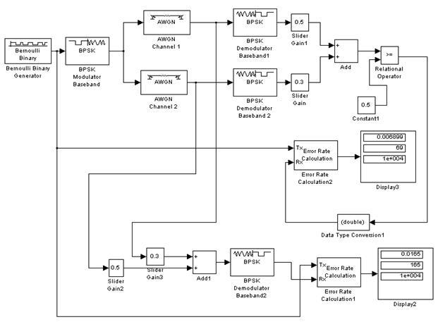 Рис. 6 Имитационная модель комбинированной обработки цифровых сигналов при пространственном разнесении
