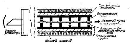 -моде (для резонатора обычно применяются вогнутые зеркала с большим радиусом кривизны) и чтобы уменьшить необходимое значение полного тока. В аргоновых лазерах приходится решать проблему катафореза атомов аргона. В самом деле, вследствие высокой плотности тока наблюдается значительная миграция ионов Аr+ в сторону катода. Вблизи катода ионы нейтрализуются электронами, эмиттированными с поверхности электрода, инейтральные атомы стремятся скапливаться в прикатодной области. Для преодоления этой трудности в дисках делают дополнительные смещенные от центра отверстия, чтобы обеспечить за счет диффузии путь для возвращения атомов от катода к аноду. Отверстия проделываются таким образом, чтобы через возвратные отверстия не шел ток за счет того, что длина образующихся путей больше, чем длина пути через центральные отверстия. Внутренняя керамическая трубка охлаждается водой для отвода большого количества тепла, которое неизбежно выделяется в трубке (несколько кВт/м). Заметим также, что в области разряда параллельно оси к трубке прикладывается постоянное магнитное поле. В такой конфигурации сила Лоренца уменьшает скорость диффузии электронов к стенкам. В результате этого число свободных электронов в центре трубки увеличивается и, следовательно, возрастает скорость накачки. Это позволяет объяснить наблюдаемое увеличение выходной мощности в случае, когда прикладывается внешнее магнитное поле. Удерживая разряд вблизи оси трубки, магнитное поле также уменьшает разрушение стенок. Заметим, что в мощных лазерах (≥ 1 Вт) зеркала монтируются снаружи трубки, чтобы ослабить деградацию зеркального покрытия под воздействием вакуумного УФ-излучения, испускаемого плазмой. У маломощных лазеров (< 1 Вт) трубка обычно изготавливается из керамического (ВеО) блока, в котором для разряда просверливается центральное отверстие. В этом случае магнитное поле отсутствует, трубка охлаждается воздухом, а зеркала, как и в Не—Ne-лазере, впаиваются в концы трубки.