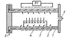 1 — кварцевая камера; 2— перфорированный цилиндр; 3 — кассета с пластинами (подложками); 4 — ВЧ-индуктор; 5—подача рабочего газа; 6 — откачной патрубок