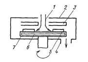 Плазменное травление осуществляют непосредственно в плазме газового травления, т.е. с участием всех химически активных частиц, как с большим (F* — 0,1 ... 1 с), так и с малым, временем жизни ('CF+з — около 10 мкс). В камерах диодного типа (Рисунок 2) пластины кремния помещают на нижнем медленно вращающемся электроде (0,1 об/с). Пластины электрически, изолированы от электрода, чтобы исключить ионную бомбардировку.