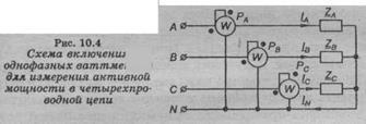 При несимметричной нагрузке активную мощность измеряют тремя ваттметрами, каждый из которых измеряет мощность одной фазы — фазную мощность. Для этого ваттметры включают так, чтобы через последовательные обмотки замыкались фазные токи, а на параллельные обмотки были поданы фазные напряжения. Тогда фазные мощности а мощность трехфазного приемника равна сумме фазных мощностей:
