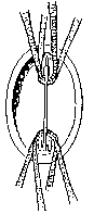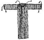 Передник оборачивался вокруг тела, причем передняя часть оставалась открытой. К верхним углам пришивались петли, к которым крепились черепаховидные фибулы. Две дополнительных петли пришивались сзади к середине верхнего края и, будучи перекинутыми через плечи, скреплялись с передними петлями фибулами. |