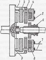 Рис 1. Фрикционное сцепление с созданием нажимного усилия электромагнитными силами: 1 – кожух; 2 – нажимной диск; 3 – якорь электромагнита; 4 – диск; 5 – контактные кольца; 6 – муфта блокировки сцепления; 7 – щетки; 8 – электромагнит; 9 – пружины.