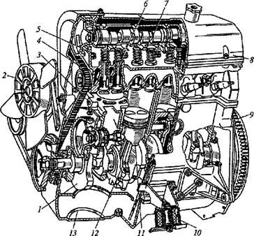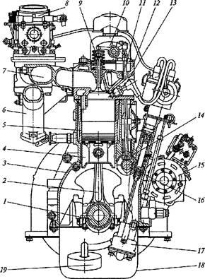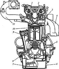 закрытом головкой 5 цилиндров, в которой находятся распределительный вал, клапаны, камеры сгорания, форсунки и свечи накаливания. Распределительный вал 7 имеет зубчато-ременный привод от коленчатого вала 13.