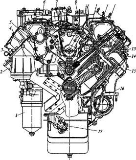 Дизель с турбонаддувом грузового автомобиля представлен на рис. 2.72. Двигатель четырехтактный, V-образный, восьмицилиндровый, верхнеклапанный, с нижним расположением распределительного вала, с жидкостным охлаждением. Рабочий объем цилиндров — 10,85 л, степень сжатия — 16. Максимальную мощность 191 кВт двигатель развивает при частоте вращения коленчатого вала 2600 мин-1