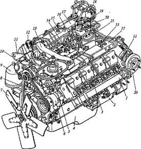 На рис. 10 показан дизель грузового автомобиля. Двигатель четырехтактный, V-образный, восьмицилиндровый, верхнеклапанный, с верхним расположением распределительного вала, с жидкостным охлаждением. Рабочий объем цилиндров двигателя — 10,85 л, степень сжатия — 17. Максимальную мощность 154 кВт двигатель развивает при частоте вращения коленчатого вала 2600 мин-1