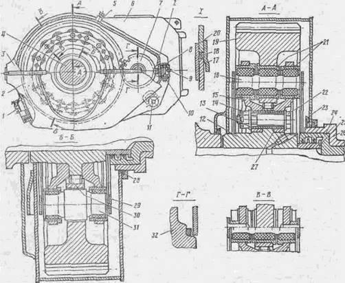 Тяговый редуктор. На тепловозе установлен одноступенчатый цилиндрический тяговый редуктор (рис. 6). Ведущая шестерня посажена на конусный хвостовик вала якоря тягового электродвигателя. Упругое зубчатое колесо состоит из посаженной на ось 4 ступицы 12, с буртом которой восемью призонными втулками 13 и восемью болтами 22 с корончатыми гайками 14 через шайбы скреплены тарелки 15 и 27. Между тарелками находится зубчатый венец 19, опирающийся на бурт ступицы 12 через девяносто роликов 30. Поверхность бурта ступицы под ролики сферическая, а зубчатого венца - цилиндрическая. Взаимное положение тарелок и ступицы заклеймено. К тарелкам прикреплены защитные кольца 29. Диаметральный зазор между венцом, роликами и ступицей составляет 0,4-0,6 мм.