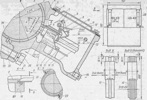 кгс • м). На обечайке верхней половины кожуха размещен сапун 5, а нижней половины - заливная горловина с пробкой 1. Уплотнением пробки служит резиновая прокладка. Нижняя кромка отверстия горловины является верхним уровнем смазки в кожухе. По разъему верхней половине приварены разновысокие накладки: наружные 17-фасонные и внутренние 20-плоские, между ними уложена резиновая трубка 18 и заложена смазка.