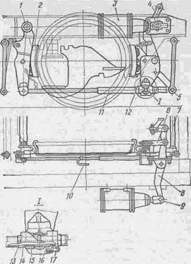 1, 12 - рычаги подвесок тормозных колодок; 2 - колодка тормозная; 3 - цилиндр тормозной; 4- балансир ручного тормоза; 5-стяжка; 6-вилка верхняя; 7-триангель; 8-балансир горизонтальный; 9 - шток тормозного цилиндра; 10 - трос; 11 - тяга; 13 - скоба; 14 - охранная труба; 15- втулка; 16- гайка; 17 - пружина.