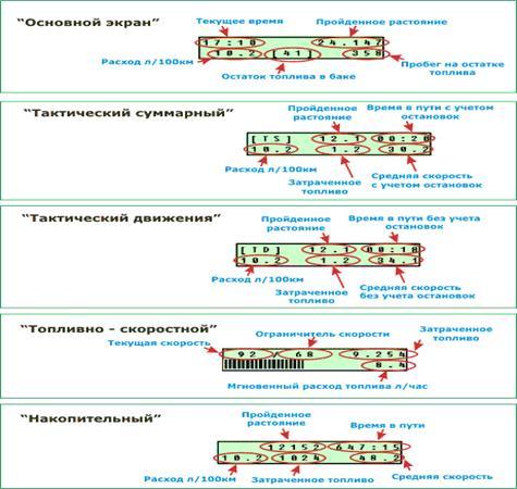 4. Остальное пространство нижней строки занято логарифмической шкалой мгновенного расхода топлива. Шкала содержит 28 позиций отражающих графически мгновенный расход топлива в литрах/час.