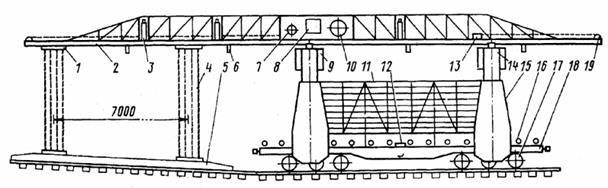 При цьому утвориться єдина підкранова колія для пересування вантажної каретки з однієї платформи на іншу. На трикутних фермах розміщені противаги для зрівноважування однобічних навантажень на платформи від каретки й блоків стрілочного переводу. Для приведення машини в транспортне положення каретку закріплюють на лівій платформі, пролітну ферму роз'єднують у місцях шарнірного з'єднання її з фермою на правій платформі. Потім механізмами 13 зрушують пролітну ферму в усередину (на лівій платформі це зрушення здійснюється за рахунок шарнірної вставки 3) і пересувають її на праву платформу із застосуванням локомотива.