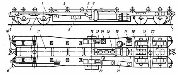 Платформа призначена для пересування пакетів нових ланок по составу до укладального крана в колієукладальному поїзді й для пересування пакетів ланок від крана на порожні платформи в путеразборочном поїзді. Будучи тяговою одиницею, ПМД пересуває частина состава робочого поїзда на ділянці робіт і виконує маневрові роботи на ланкоскладальній базі. Вона складається з рами 1 (Малюнок 1.4) з роликовим конвеєром 2, двох ходових візків 7, двох лебідок 17 для пересування пакетів рейкових ланок, пневматичного встаткування, двох дизель-генераторних установок, двох постів керування 4 зі знімними сидіннями 3 й електроустаткування. У середній частині рами розташовано дев'ять відсіків для розміщення основного встаткування. зверху вони закриті кришками 11. У центральному відсіку розміщені масляні й водяні радіатори 12. По обох сторони від них перебувають двигуни 15 дизель-генераторних установок. далие симетрисно із правої й лівої сторони розташовані генератори 16, контактори 18 і повітряні резервуари 20 пневматичної системи. Для доступу до дизель-генераторних установок, крім верхніх кришок, крім верхніх кришок передбачені бічні люки 6. Моторна платформа обладнана типовими ударно - упрямними приладами 10, автомобільними фарами 9, а також приладами світлової й звукової сигналізації. По вий довжині платформи на рамі встановлені два ряди двухреборчатих роликів. утворюючий роликовий конвеєр 2. По краях платформ ролики встановлені частіше, ніж по середині, що полегшує перехід пакета з однієї платформи на іншу. Поза відсіками на рамі розташовані акумуляторні батареї 13, баки для палива 21, баки для масла 14, лебідки для пересування пакетів ланок і компресор 2. По контурі платформи встановлені чотири пісочниці 5 й 8. Навантаження від рами платформи на ходові візки передаються через поперечні шкворневі балки з п’ятниками 19. Живлення постійним струмом електродвигунів ходових візків, лебідок і кранового устаткування здійснюється установкою, що складається з дизеля В1Д6 і генератора П-111П, з'єднаних втулочно-пальцевою муфтою.