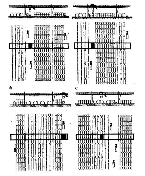 Рисунок 2. схема размещения контейнеров на ППК с расположением в пролете крана: а и б – автопоездов; в – железнодорожных путей; г – железнодорожных путей и автопоездов.