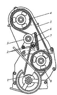 коленчатого вала. Этим же ремнем вращается зубчатый шкив 9