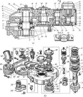 Рис. 2.1. Редуктор (а) механізму повороту екскаваторів ЭО-5123 і його деталі (б): 1 - Обігаюча шестірня, 2 - вал, 3, 9, 11, 28, 34 - втулки, 4, 14, 19, 21, 33, 38 - кришки, 5, 13, 26, 32, 35, 39 - підшипники, 6 -і кільце, 7, 23 - склянки, 5 - манжета, 10, 17, 30 - зубчасті колеса, 12 - корпус, 15 - рим-болт, 16, 41 - масельнички, 18, 20, 29 - вали-шестірні, 22 - напівмуфта, 24 - фланець, 25 - палець, 27, 31 - кільця розрізні, 36 - шайба, 37 - спускний кран, 40 - щуп, 42 - гідромотор