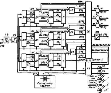 Синтезатор частот вырабатывает сигналы рабочих частот, используемые для работы узлов БПП: 64fн - сигнал тактовой частоты для основных узлов БПП; U-сигнал контрольной частоты; F3 - сигнал запуска, с помощью которого осуществляется перезапуск комплектов.