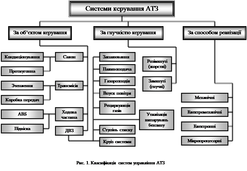 Системи керування можна класифікувати за трьома основними ознаками: за призначенням або об’єктом керування; за гнучкістю реалізації оптимізуючого алгоритму; за способом реалізації системи, що визначає рівень її влаштування (рис. 1). Розглянемо об’єкти АТЗ, для керування якими використовуються мікропроцесорні (МП) системи керування, та визначимо інформаційні параметри і критерії оптимізації.