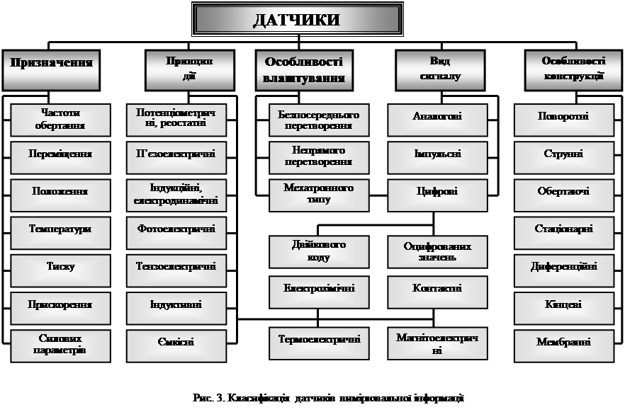 Класифікація датчиків вимірювальної інформації, що використовуються в системах керування автомобілем, наведено на рис. Пояснимо деякі класифікаційні ознаки та наведемо приклади датчиків, що їм відповідають.